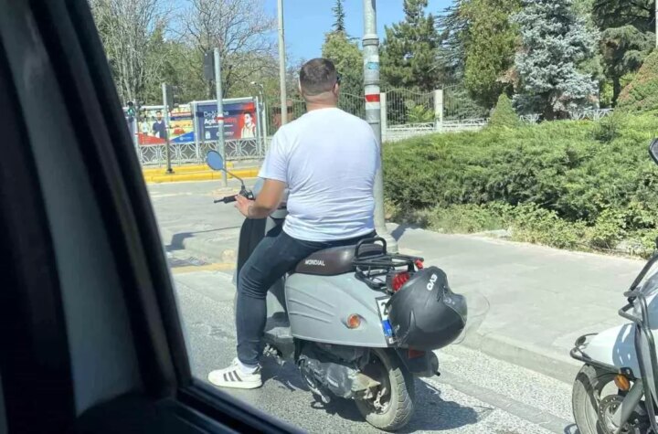 Eskişehir'de, başına takmadığı kask ile motosikletinin plakasını kapatan bir şoförün trafiği tehlikeye düşürdüğü olay...